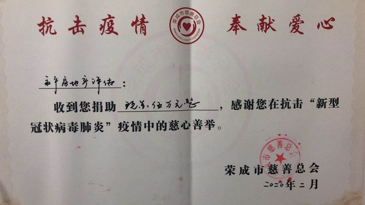 2020年新春佳节本该是家人亲友久别重逢、知己故交相邀团聚的欢乐时光,但突如其来的新型冠状病毒扰乱了这一切。自新型肺炎爆发以来,山东永平房地产评估有限公司在做好自身防控的同时,积极响应政府的号召向荣成市慈善总会捐款五万元。共抗疫情,大爱无疆!天佑中华!